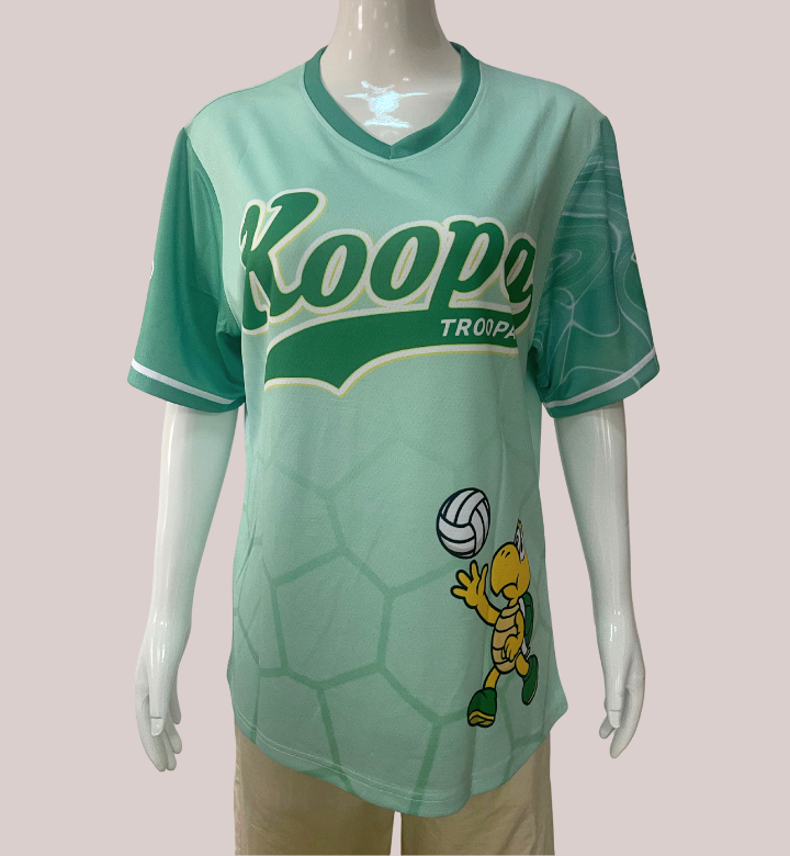 Bring fun and flair to the court with this eye-catching, team-ready volleyball jersey inspired by the iconic Koopa Troopas. Designed in vibrant green tones with a subtle hexagonal pattern mimicking turtle shells, this sublimated jersey features bold “Koopa Troopas” lettering across the chest and a playful cartoon Koopa spiking a volleyball at the front.